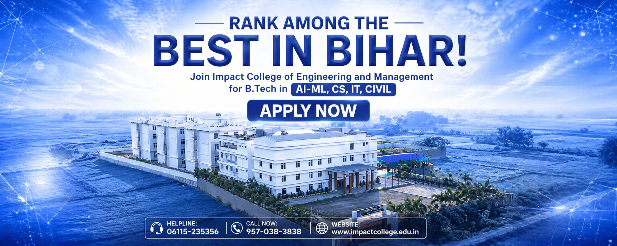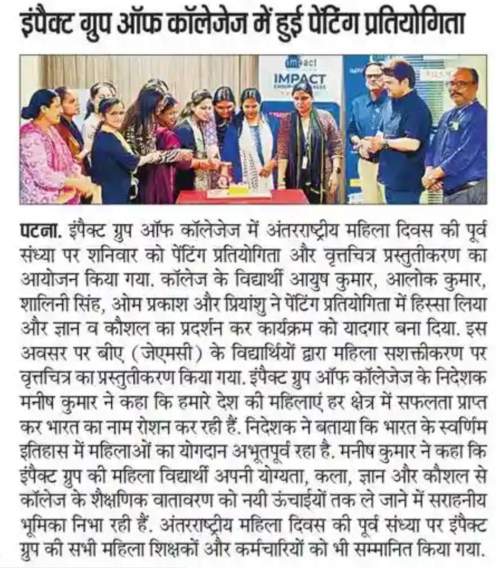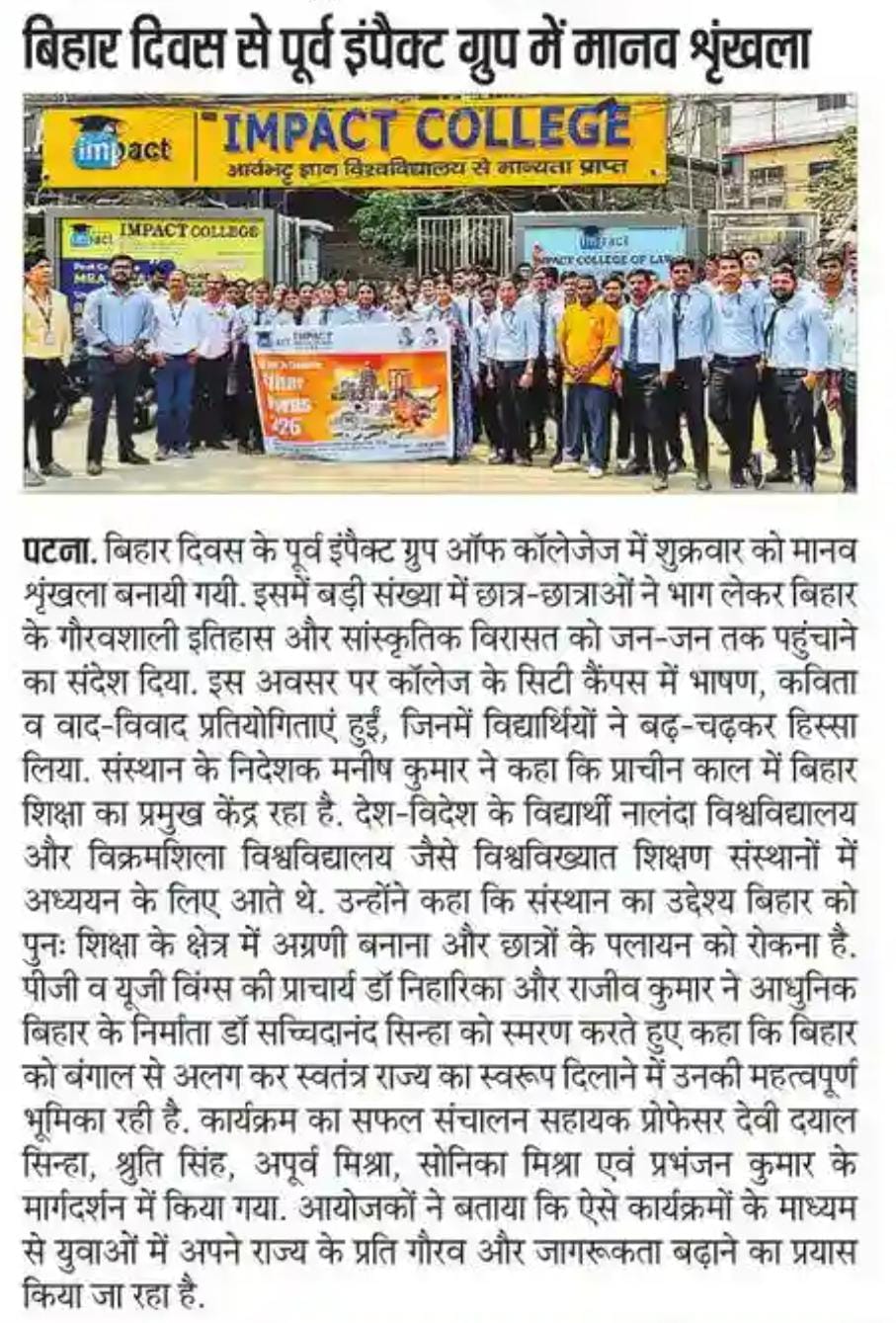 Impact College was established in 2014, is a leading BCA College in Patna, BBA College, B. Tech College, BA (JMC), B.Com College, MCA, and MBA College in Patna. We are offering excellence in higher education across various disciplines. With a student-centric approach, industry-aligned curriculum and experienced faculty, we are committed to nurturing future leaders. Our state-of-the-art infrastructure, innovative learning methods and strong industry partnerships provide students with unparalleled opportunities for growth and success.